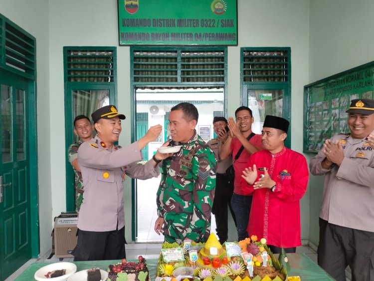 TOPIKPUBLIK.COM - PERAWANG - Polsek Tualang, Sinergitas TNI-POLRI, Polsek Tualang memberikan nasi tumpeng kepada Koramil 04/ Perawang dalam rangka HUT TNI ke-78 TH di Mako Koramil 04/Perawang.