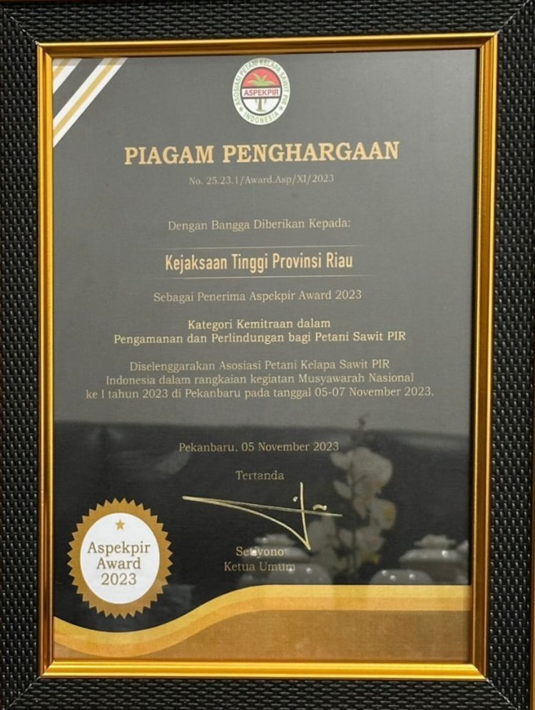 Selanjutnya kegiatan dilanjutkan dengan pemberian penghargaan kepada Kejaksaan Tinggi Riau yang diterima oleh Koordinator bidang Tindak Pidana Khusus Kejaksaan Tinggi Riau Fauzy Marasabessy, S.H, M.H dari Asosiasi Petani Kelapa Sawit Program Inti Rakyat (ASPEKPIR) karena dipandang berperan mendorong terjadinya perbaikan tata kelola perkebunan kelapa sawit di Provinsi Riau.
