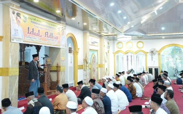 TOPIKPUBLIK.COM - ROHIL - Bupati Rokan Hilir (Rohil) Afrizal Sintong beserta keluarga dan ratusan masyarakat melaksanakan kegiatan ibadah sholat Idul Adha 1444 H di Masjid Agung Al Bagansiapiapi, Kamis (29/6/2023).