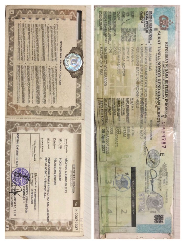 Dan kini keempat orang pelaku berhasil di amankan polsek kandis Ada pun barang bukti yaitu satu unit sepeda motor yamaha nopol (BM 3544 MAG) Dan satu buku pemilik kendaraan bermotor (BPKB) dan satu surat tanda nomor kendaraan (STNK)