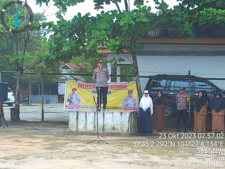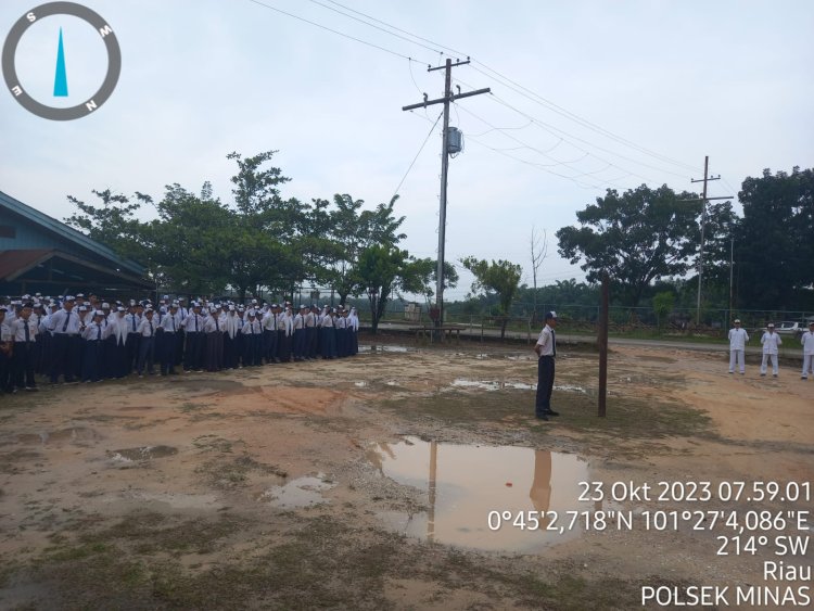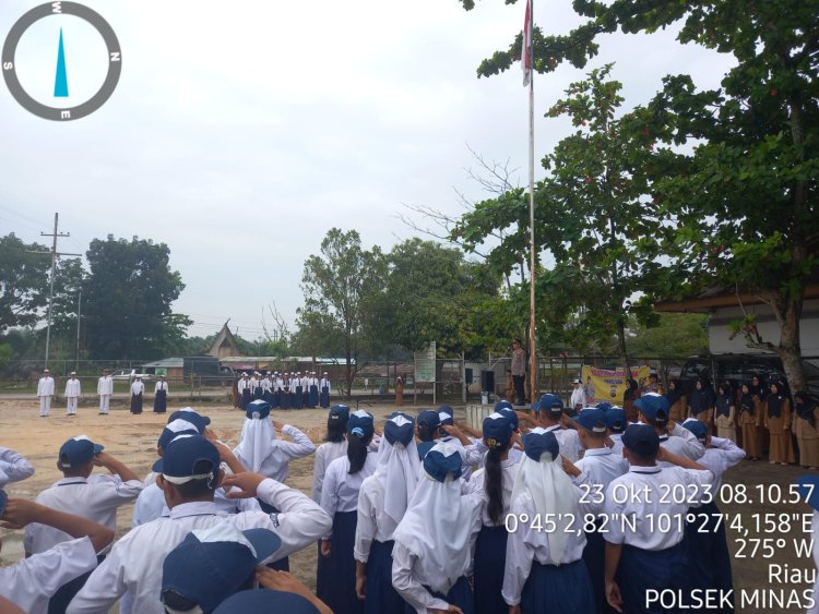 TOPIKPUBLIK.COM - Minas/Siak - Kapolsek Minas AKP Wan Mantazakka SH MH bertindak sebagai Pembina upacara bendera Senin dalam giat Police Goes To School Polsek Minas - Polres Siak di SMP Negeri 1 Minas, Senin (23/10/2023) sekira pukul 07.30 WIB.